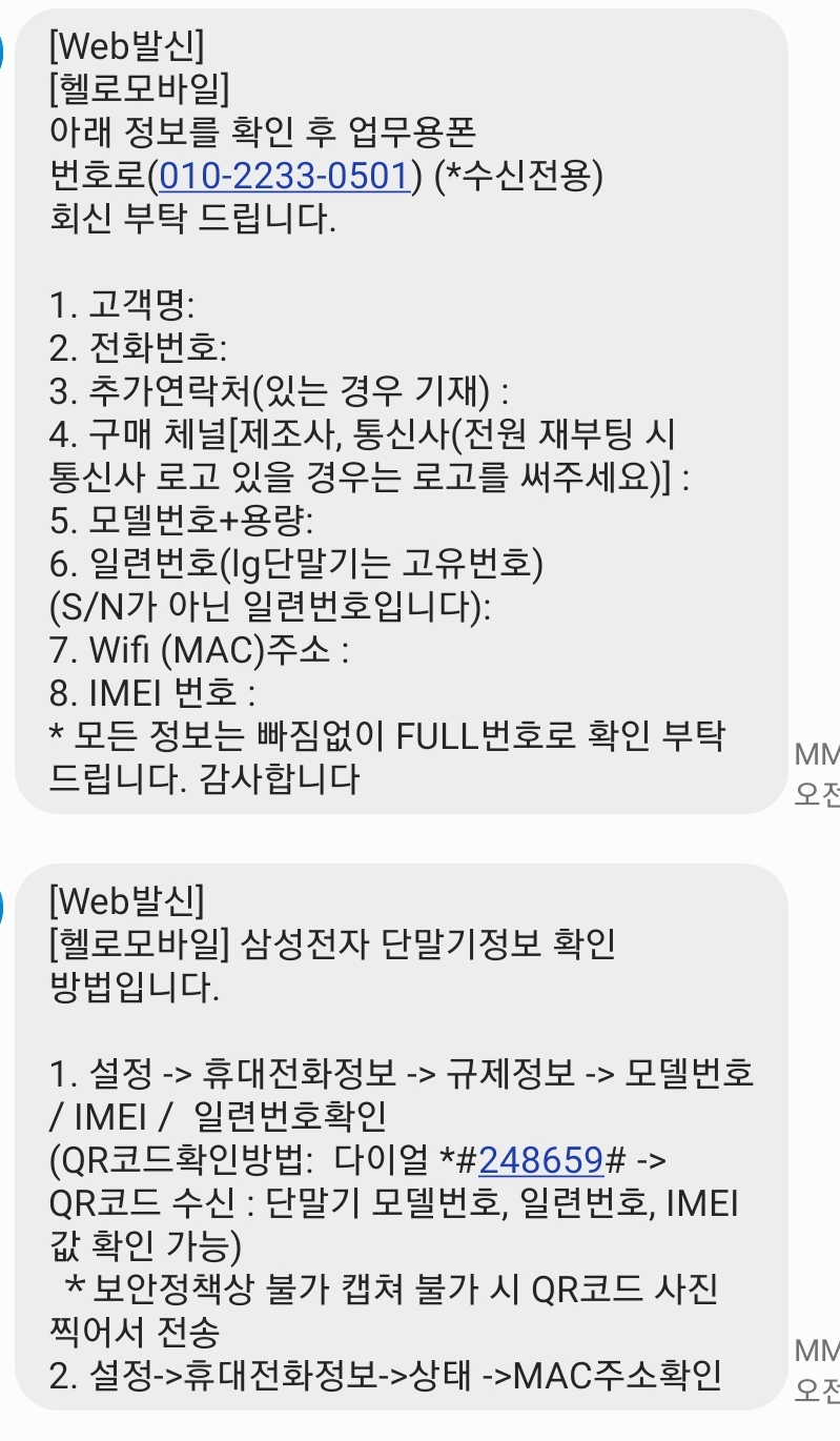 내용은 모델번호, IMEI, 일련번호, wifiMAC 을 보내줘야 합니다.