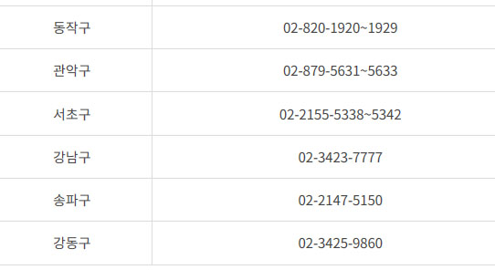 <<동작구, 관악구, 서초구, 강남구, 송파구, 강동구 의 경우 콜센터 번호>>