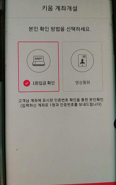 (4) 본인확인으로 아까 등록했던 계좌에 1원입금으로 인증번호를 받아서 인증해주면, 계좌 개설이 완료됩니다.