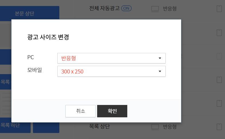 <3> 광고사이즈 변경에서 모바일의 '반응형'을 원하시는 세가지 사이즈 중 하나로 설정해주시고