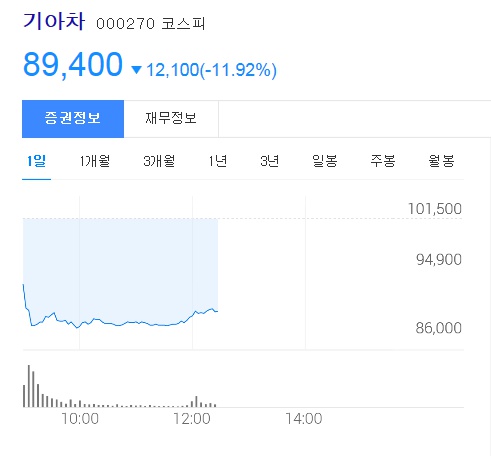 현대차는 약 5%마이너스였고, 기아차는 오전장때 13%까지 마이너스로 더 큰 타격을 입었네요.