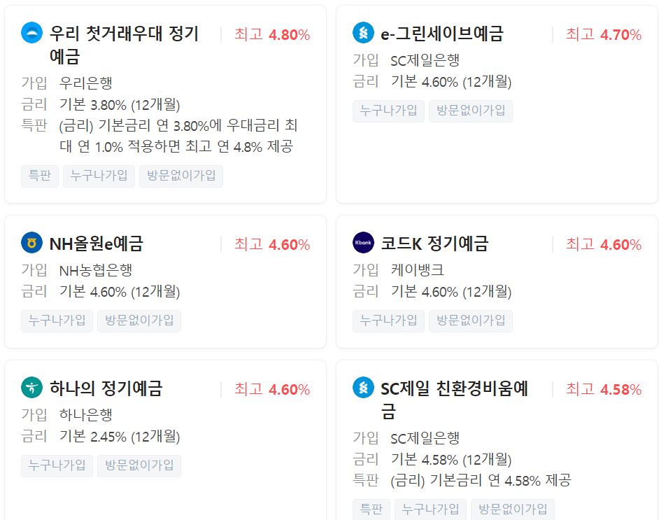 우리은행의 첫거래정기예금이 4.8% 로 최고 수준이네요.