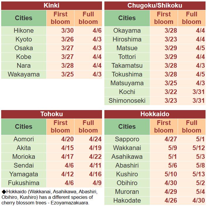 일본 전국지도로 예상된 각 지역별 벚꽃 개화시기와 만개시기를 표로 보기