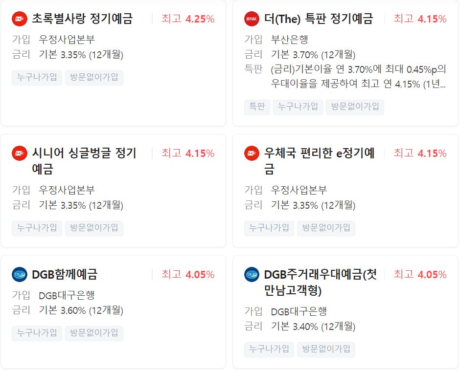 현재 우정사업본부의 초록별사랑 정기예금이 가장 금리가 높게 소개되고 있습니다.