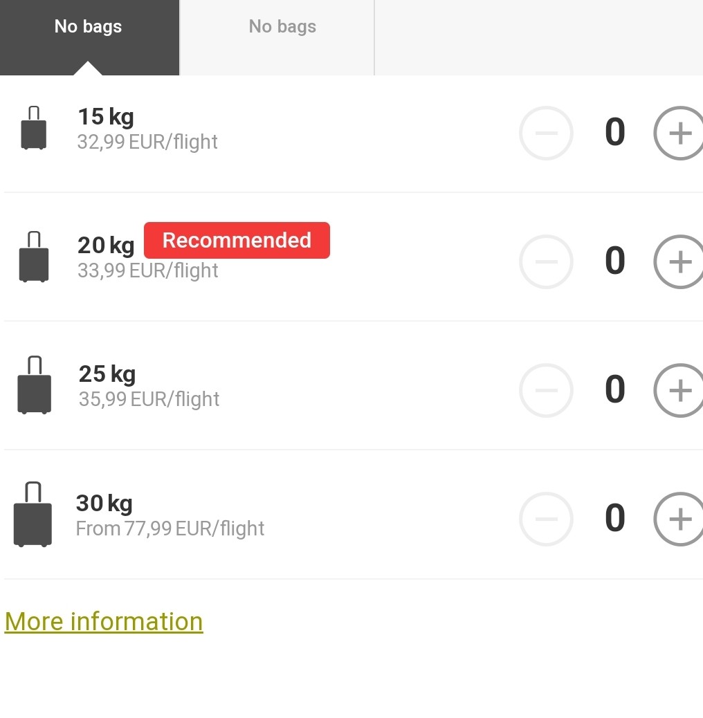 만약, 기내캐리어로 짐을 올려야 하는 경우 32.99유로/1인 으로 추가 가능하다는