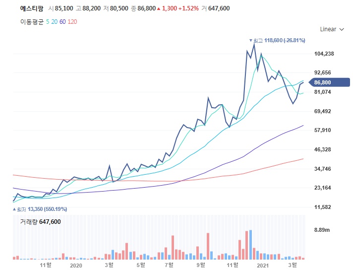 2020년말 최고가 118,600원을 찍었다가 현재 8만원대이니