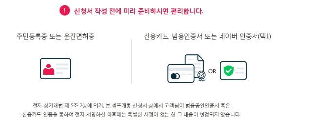일단 신분증 있으면 되고, 본인인증에 필요한 신용카드 또는 범용공인인증서나 네이버인증서 사용가능합니다.